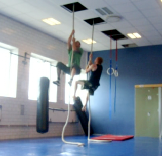 Jag och Björn träffades (bakfulla) kl. 10 för att sätta upp repen och ringarna i taket på klubben. Hoppade dagens WOD och körde istället