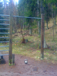 Chinsen kändes inget vidare. Mycket kip, i den mån man kan ha det med vikt. Kanske led lite av att jag blev tvungen att vända upp vikter för böj och press (har ingen ställning hemma). Chins fick bli utomhus.