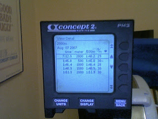 Gick ut för hårt (se bild) och på slutet fick jag känna av att jag cyklat 2 mil i högt tempo idag samt kört tunga bakböj igår. Sista 500 metrarna var en pärs, men det är dom ju nästan vilket tempo man än håller på den här distansen. Nåväl, även om jag stadigt sjönk i den förväntade sluttiden är jag nöjd med att glida in på under 7:15, vilket var där årsmålet låg. Man är ju ingen roddfantom som Björn direkt. Nu slipper man göra det här igen i år iallafall…