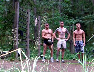 ”Wet Helen” – 3 varv av 400m löpning, 21 höga KB svingar (24kg), 12 Pullups gjort i ösregn. Mycket hal stång och bell gjorde detta till en greppövning. Tid därefter: 9:37. Mycket fler brott än vanligt (svingar obrutna och löpning gick okej, pullups hemska på den hala stången).